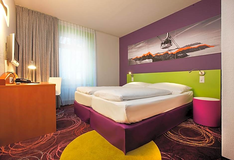 This room is modernly decorated with contemporary furniture and bright colors. It features a flat-screen TV with cable channels, a work desk, and a bathroom with shower and toilet.